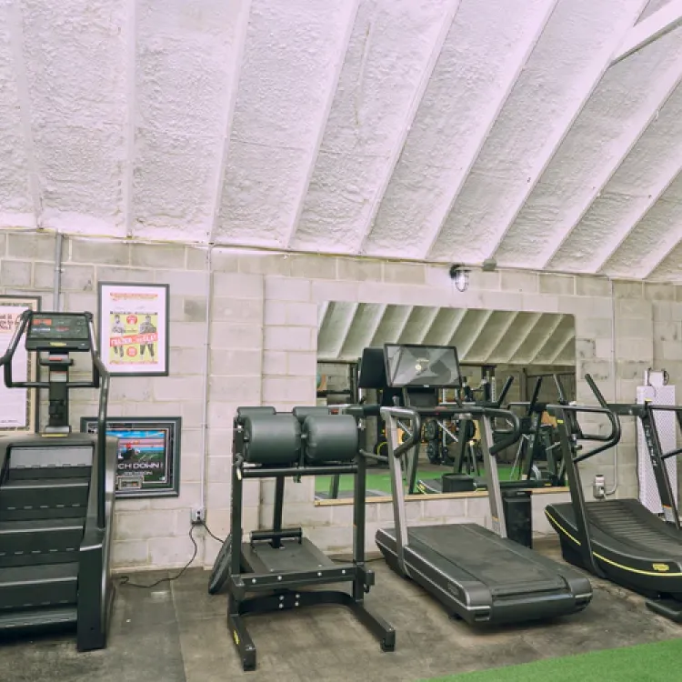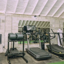 Experience a fully equipped gym that blends rustic charm with high-performance gear, including curved treadmills, rowers, and free weights in an airy, open setting.